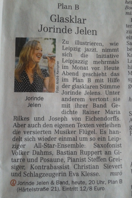 Bild Verfasst von Volker Veröffentlicht in 31. Oktober 2013 Veröffentlicht in Jorinde Jelen und Band im plan b (Review) Kommentare Hinterlasse einen Kommentar Ankündigung in der LVZ Größe: 422 × 633 Kommentiere oder hinterlasse ein Trackback: Trackback-URL.